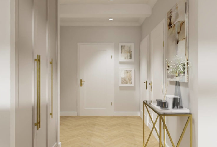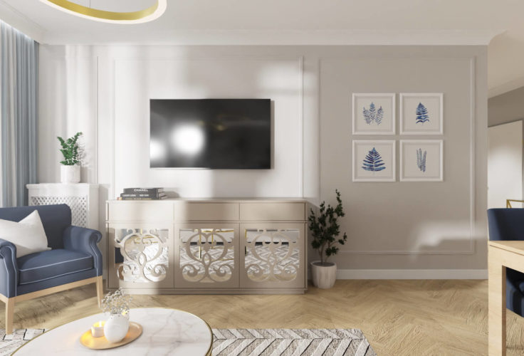 Projekt salonu z aneksem kuchennym oraz przedpokój. Wszystko utrzymane w stylu nowojorskim. Chłodne odcienie beżu z dodatkiem zgaszonego granatu oraz błękitu zawsze wyglądają elegancko. Dodatki w złotym kolorze dodają odrobiny luksusu. Poduchy, tkaniny, dywan i dodatki nadają przytulności i domowego charakteru.