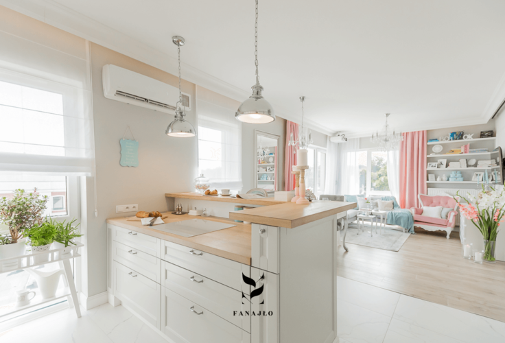 Baza kolorystyczna to biel, szarość, marmurowe wzory płytek podłogowych czy panele w kolorze klasycznego dębu. Dodatki w palecie pasteli pozwalają na łatwą zmianę kolorystyki i dopasowanie wnętrza do pory roku, świąt, okazji typu np. urodziny dziecka.